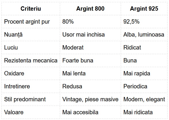 Tabel comparativ: argint 800 vs argint 925